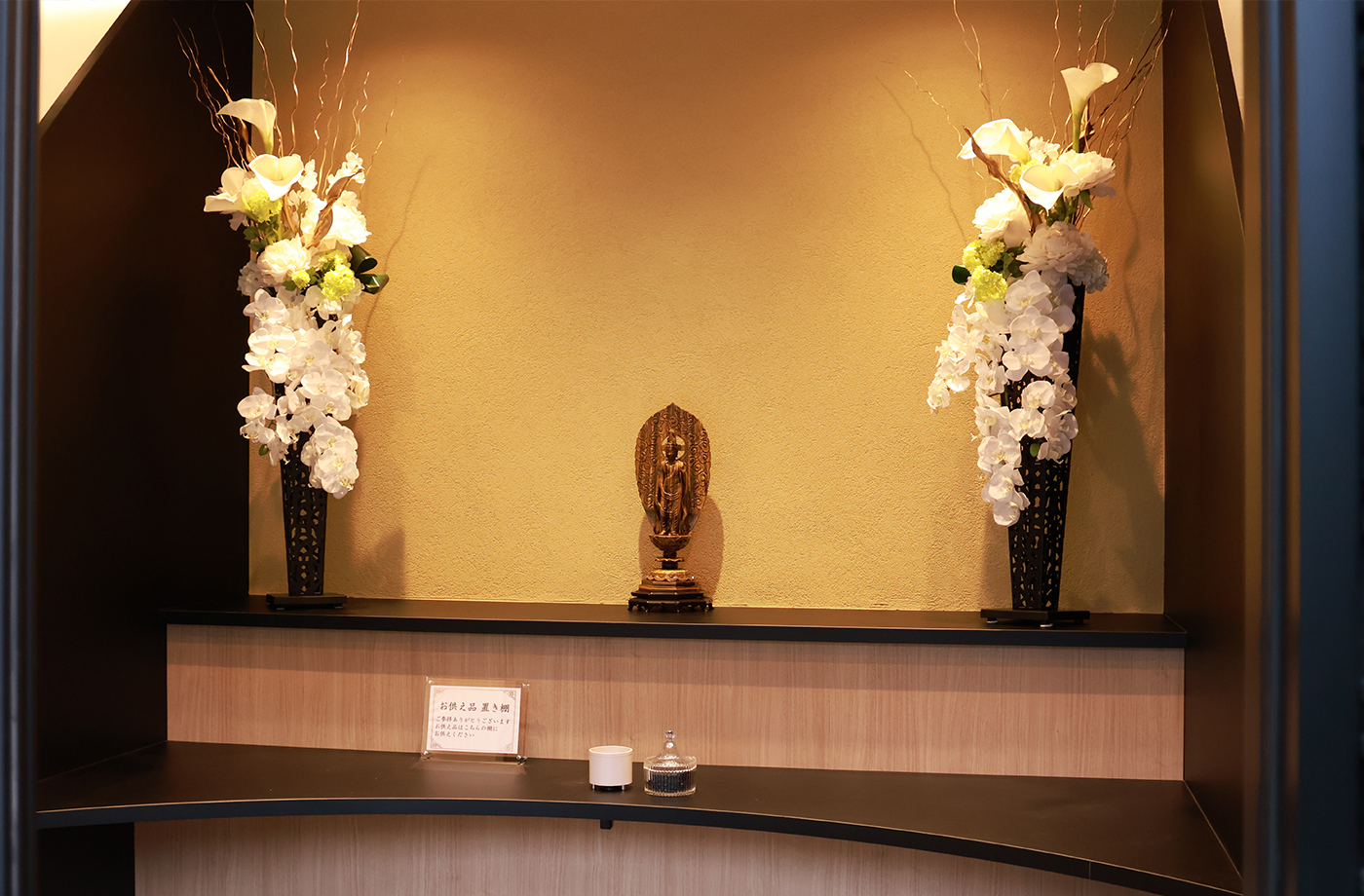 大切な方を静かにお送りするための家族葬ホール、清潔で落ち着いた館内、